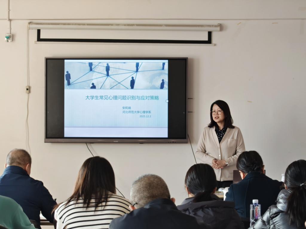 在第一教学楼408室举办学生心理健康教育工作专题培训。本次培训以“大学生常见心理问题识别与应对策略”为主题,特别邀请河北师范大学应用心理学硕士生导师安莉娟教授主讲,学院党委书记王剑彪、党委副书记李丽及全体专兼职辅导员参加。