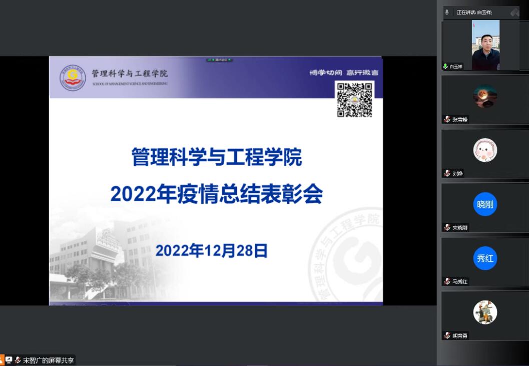 白玉祥对学院一年来的新冠疫情防控工作进行了全面总结。他讲到,今年的疫情反反复复,愈发严峻,是对学校的一个大考,一场大战。学院紧跟学校的科学决策,与各部门紧密配合,严格落实各项政策,积极主动作为,保证上下同声,师生一心。面对疫情,学院职工挺身而出,他们用实际行动阐释了管科抗疫精神:一是靠前指挥,深入一线,体现了大无畏的担当精神;二是党建引领,筑牢堡垒,体现了党员干部的先锋模范作用;三是情系学生,以人为本,体现了尊重生命,健康至上的大爱情怀;四是面对困难,集体请缨,逆势前行,体现了同舟共济,守望相助的团结精神;五是线上教学,同质同效,彰显了网上育人、思政育人的时代魅力。